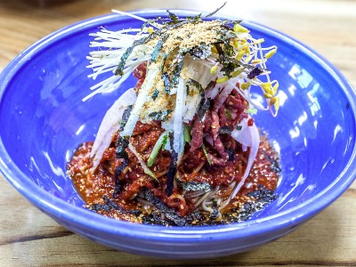 100%메밀싹육회비빔국수